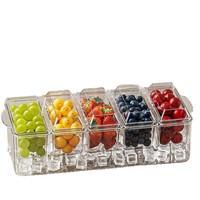 Soporte de plástico PET transparente para condimentos con bandeja de hielo, 5 compartimentos extraíbles, forma rectangular para alimentos refrigerados